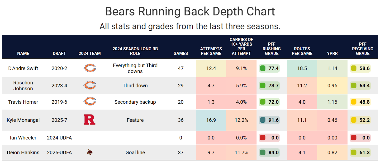 While Swift was an early-down back and Johnson a third-down back last season, those roles may reverse. The Bears now have Ben Johnson as the head coach, and Swift’s one season with Johnson at offensive coordinator was in 2022, when he was the third-down and two-minute drill back. From a measurable perspective, Johnson is much more like David Montgomery and Jamaal Williams, while Swift is more like Jahmyr Gibbs.