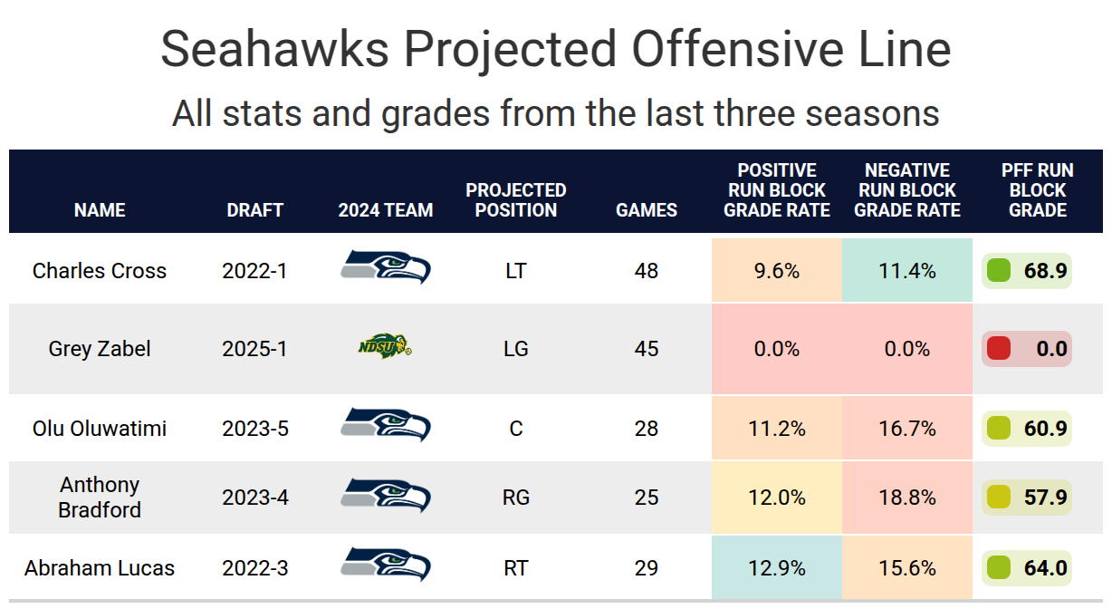 One consistent issue for Walker has been Seattle’s offensive line, which regressed from an average unit in his first two seasons to a bottom-10 group in 2024. However, there’s reason for optimism. Charles Cross took a major leap forward last year, earning a 77.9 run-blocking grade and 81.3 pass-blocking grade, establishing himself as one of the league’s best young left tackles. The Seahawks also spent a first-round pick on guard Grey Zabel, who posted an 86.4 run-blocking grade in his final season at North Dakota State and should provide an immediate upgrade.