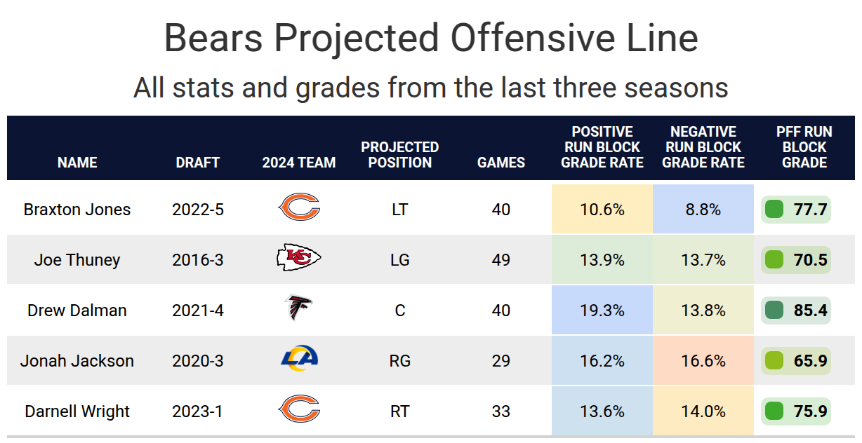 Whoever ends up leading the Bears in carries will get significant help from a re-worked offensive line. The Bears' tackle duo is in the top 12 in terms of PFF grade among tackles 26 or younger. They both rank in the top eight in run blocking, and Chicago added Ozzy Trapilo in the second round. Chicago traded for Joe Thuney and Jonah Jackson and signed Drew Dalman in free agency. Jackson has experience playing under Ben Johnson in Detroit. The Bears' run-blocking grade was average last season, but they should be among the better lines this season. They don’t have the dominant force on the line like Penei Sewell or Frank Ragnow, but there are no weaknesses.