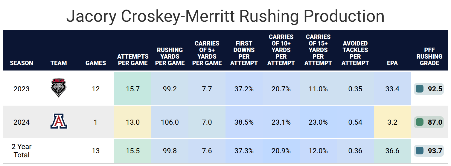 Jacory Croskey-Merritt spent 2019-2022 as a running back for Alabama State, playing a significant role in 2021 and 2022 with a steadily improving grade each season. He transferred to New Mexico in 2023 and significantly improved in both the running game and passing game, averaging a first down and breaking long runs at a ridiculously high rate, albeit against a lower level of competition than most running backs from the 2025 draft class. He was primarily used as a runner with New Mexico and was very rarely used as a receiver. When he was, he earned a decent grade.