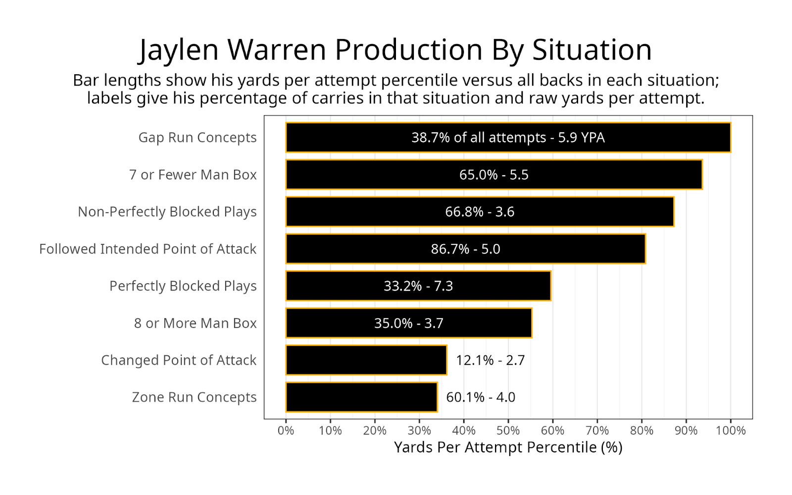 Warren was an undrafted rookie in 2022 who immediately found a role in the Pittsburgh Steelers‘ offense as the No. 2 running back and third-down back. He played 23 snaps in his first game and averaged over 30% of Pittsburgh's offensive snaps throughout the rest of the season. He slowly but surely earned more touches, finishing two games with double-digit carries over the last four weeks.