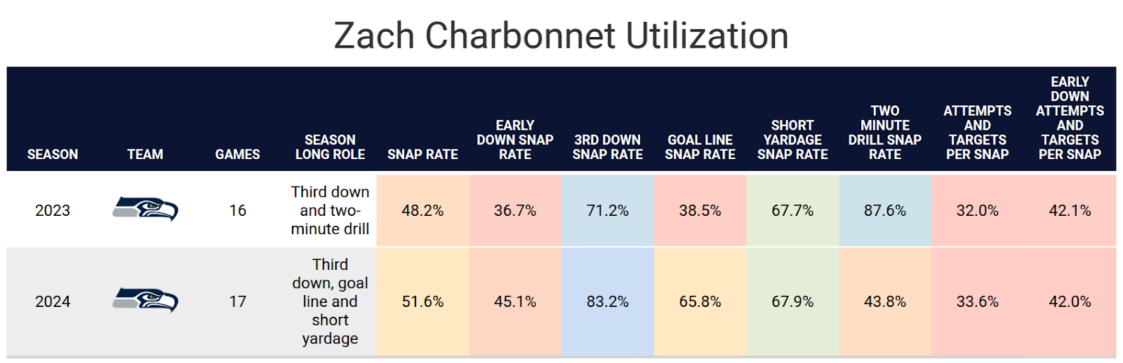 Charbonnet became a feature back for those two weeks. Unfortunately, he averaged 3.4 and 3.2 yards per carry in those games, respectively, and averaged 13.4 PPR points in his two starts. Walker returned for the final five games of the season, where playing time was a near-even split, but Walker was dominating carries while Charbonnet averaged 19 rushing yards per game.