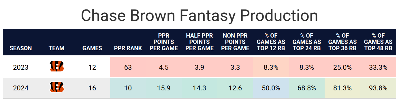 - Chase Brown was a league-winner: Brown wasn’t drafted to be a fantasy starter, but scored the third-most fantasy points per game over an eight-game stretch at the end of the season.