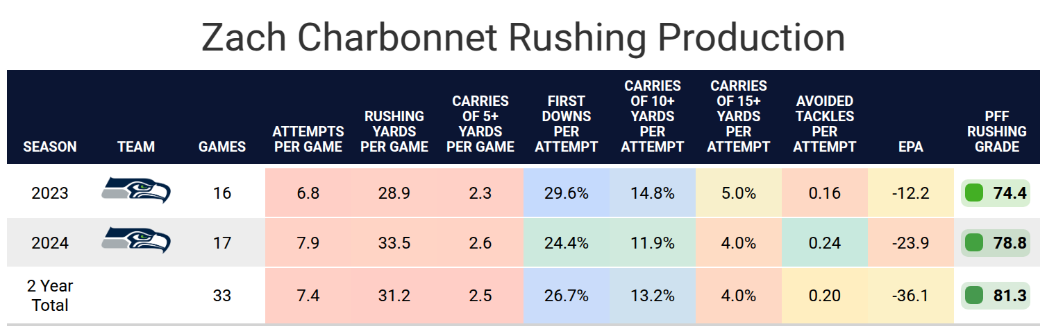 Walker has generally graded better as both a runner and a receiver over the last two seasons. Charbonnet has been more consistent at converting first downs, but Walker has broken more big plays when given the opportunity. Charbonnet has been notably better on gap runs than zone, finishing with 5.1 yards per attempt on gap plays compared to 3.5 on zone. The reverse is true for Walker, who averages 4.4 yards per attempt in his career on zone runs compared to 4.0 on gap runs.
