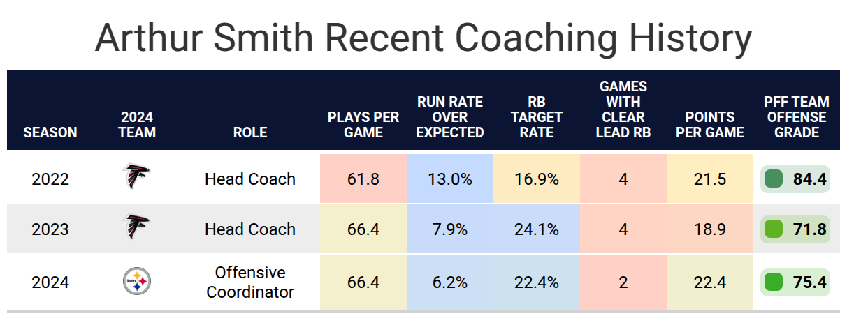 Warren will have Arthur Smith as his head coach for a second straight season. This is a big benefit for Warren because Smith’s offenses have always been more run-heavy than most. In the last two seasons, he’s had no problem throwing to running backs. When Smith was asked if the split between Johnson and Warren would be similar, Smith said it wouldn’t, suggesting Warren would play more on early downs than he did last season. He also talked about the need to run over 500 times, a mark only six teams hit last season, including the Steelers. The Steelers signed Aaron Rodgers at quarterback, which could lead the team to be less run-heavy. However, Rodgers has a high rate of throwing to running backs both with the New York Jets and Green Bay Packers, so this should help ensure Warren sees plenty of targets.