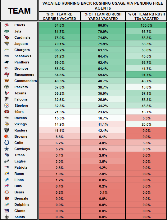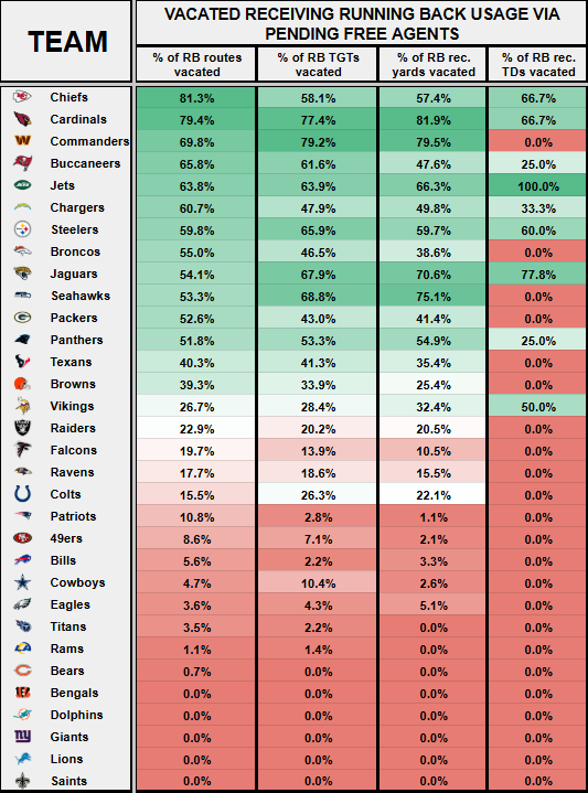 - The Chiefs lead the way again, as was the case when it came to potentially vacated carries, it makes sense that those pending free agents also made up the majority of backfield routes as well.
