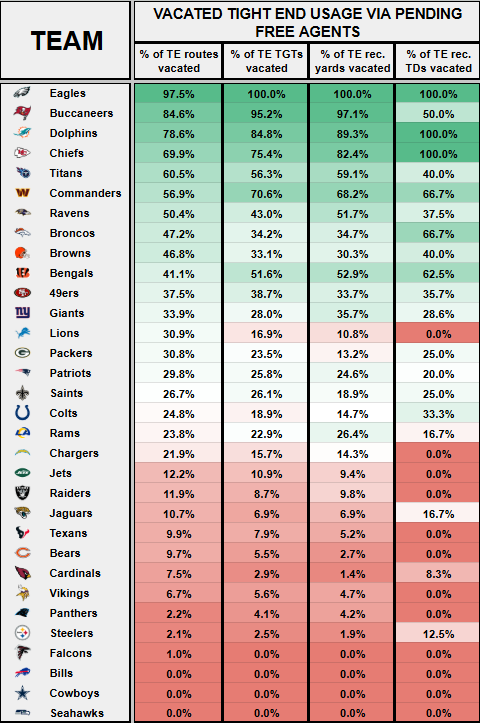 Highlighting the teams with the highest expected percentage of available tight end routes and targets from the 2025 season, this chart relies on expected free agents and includes the percentage of routes run, targets, receiving yards and receiving touchdowns their slated free agent tight ends accounted for this past season.