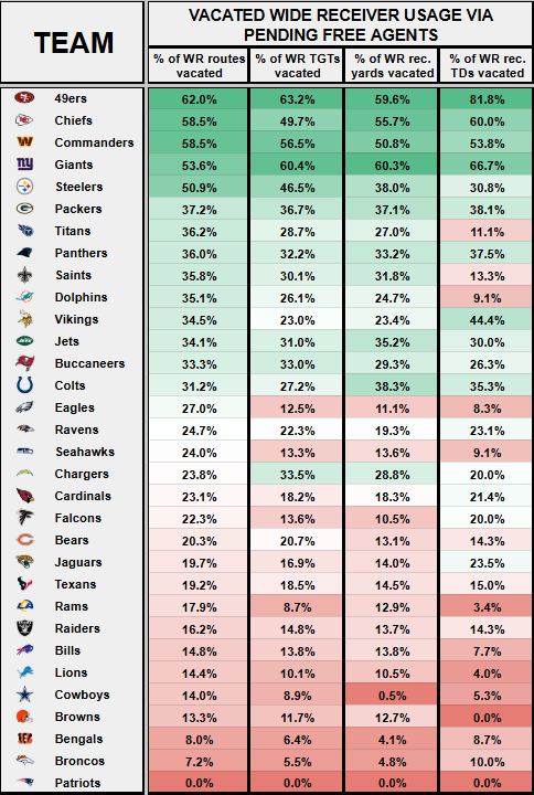Below are the skill position rankings of each team as things stand right now – no franchise tags, re-signings, etc. – and state how much of their 2025 usage they are currently slated to lose in free agency. The full free agent list is pulled using Over The Cap’s free agency tracker.