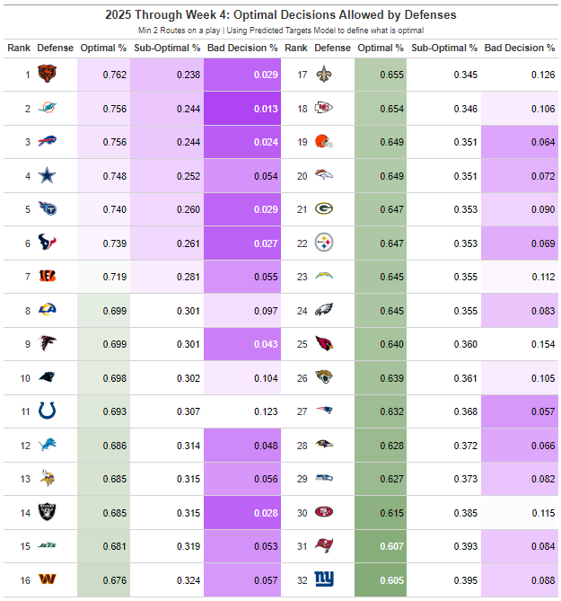 These are results from the first four weeks of the season. A defense allowing an optimal decision isn’t always a bad thing for the defense, as the gameplan could be to cover deep and intermediate passes while allowing open targets underneath. Forcing bad decisions is mostly a good thing, as these could lead to turnovers — but, depending on whether the defense is in man or zone, this might be more indicative of the quarterback thinking they have a one-on-one advantage and throwing more jump balls.