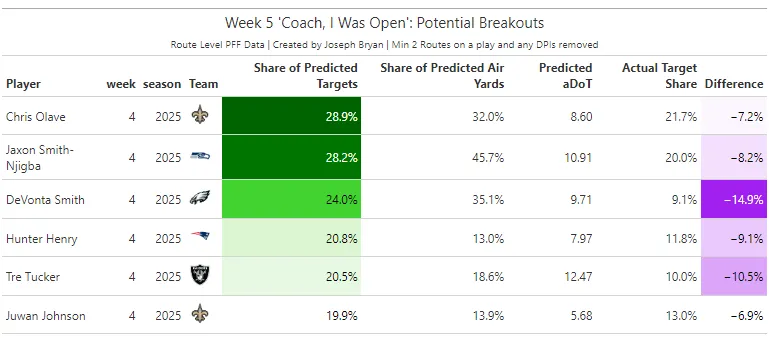 These are players who were open significantly more than they garnered targets in Week 4. In general, players who show up on this list see an uptick in Targets per Route Run and Target Share relative to both themselves and all players with similar target shares.