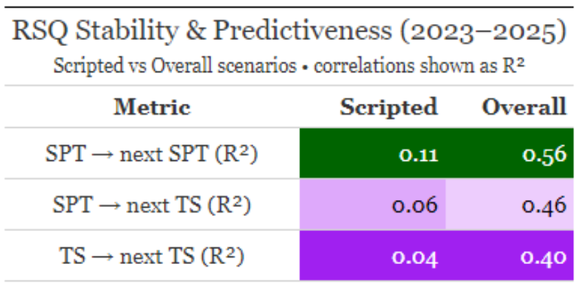 Scripted SPT is roughly three times more stable than traditional target share and 33% more predictive. We discussed this in the second article of “Coach, I Was Open.” But over the entire game, SPT is incredibly stable and predictive, as seen in the table above.