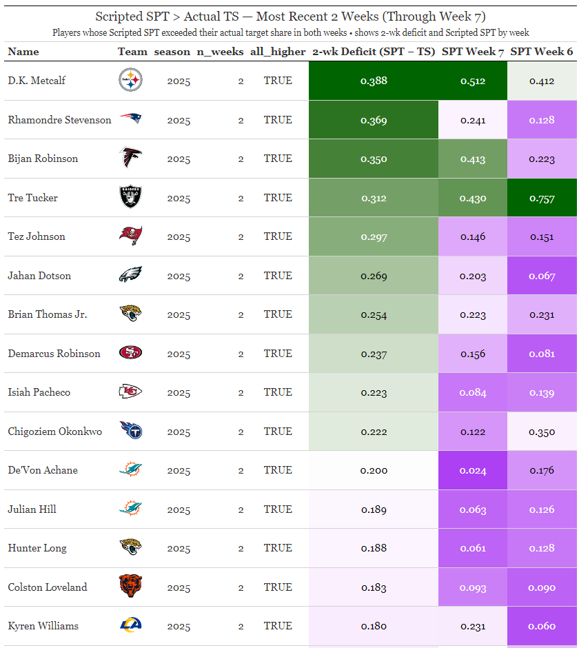 D.K. Metcalf is our headliner for breakouts this week, and has a massive scripted SPT deficit. I would expect him to receive plenty of early targets on Sunday Night Football this week against the Packers.