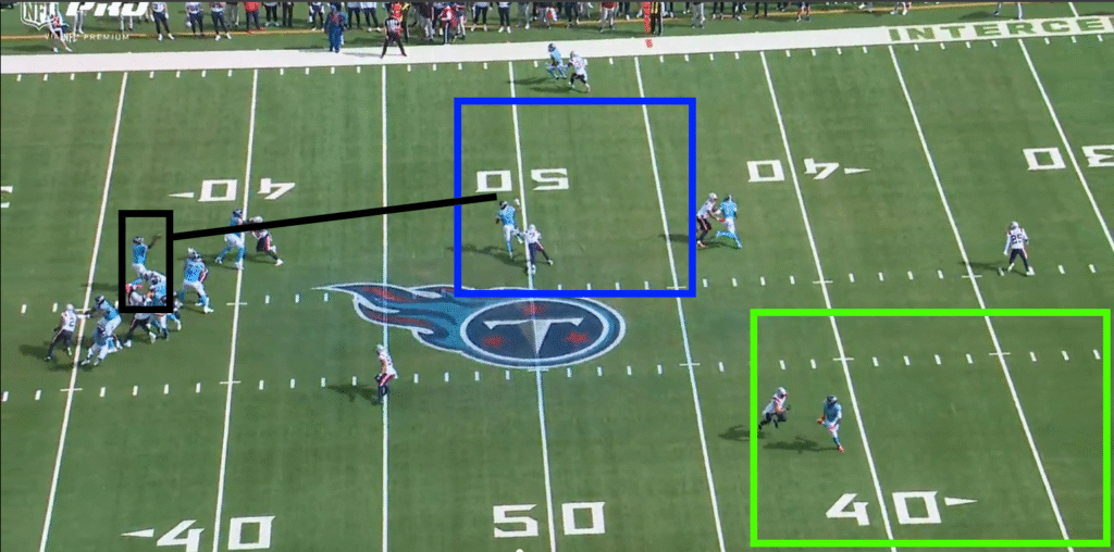 Although Ayomanor’s probability of a target is higher here, I believe Dike would have been the better choice. Ayomanor’s defender ends up falling as the pass is thrown, causing an explosive play of 20 yards. Had the defender not fallen, this is most likely a gain of fewer than eight yards. On the other hand, Dike earned massive separation 15-plus yards from the line of scrimmage and possibly could have scored with a well-placed ball.