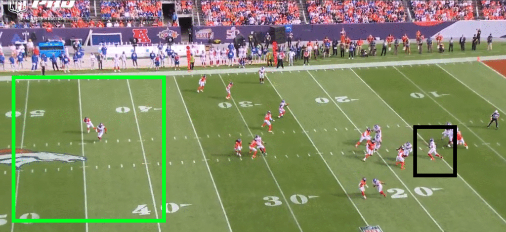 Lil’Jordan Humphrey breaks through the Broncos’ Cover 6 defense into a wide-open single-coverage situation (56% target probability). He has multiple steps on the defender and probably scores a touchdown with a well-placed ball. Dart uses his excellent scrambling ability to extend the play and make what ends up being an incredible throw and catch to Wan’Dale Robinson for 23 yards.