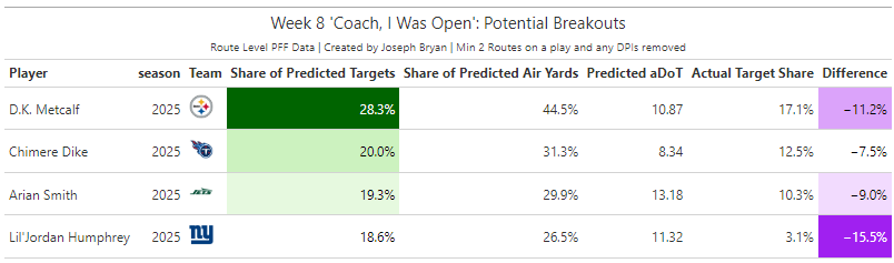 These are players who were open significantly more than they garnered targets in Week 7. In general, players who show up on this list see an uptick in targets per route run and target share relative to both themselves and all players with similar target shares.