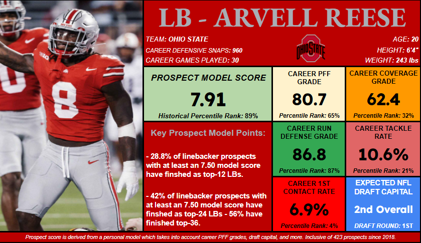 - While he’s often compared to Micah Parsons, Reese isn’t quite on the same level of prospect in terms of his overall college performance, as Parsons was an elite performer in this model (9.04 score).