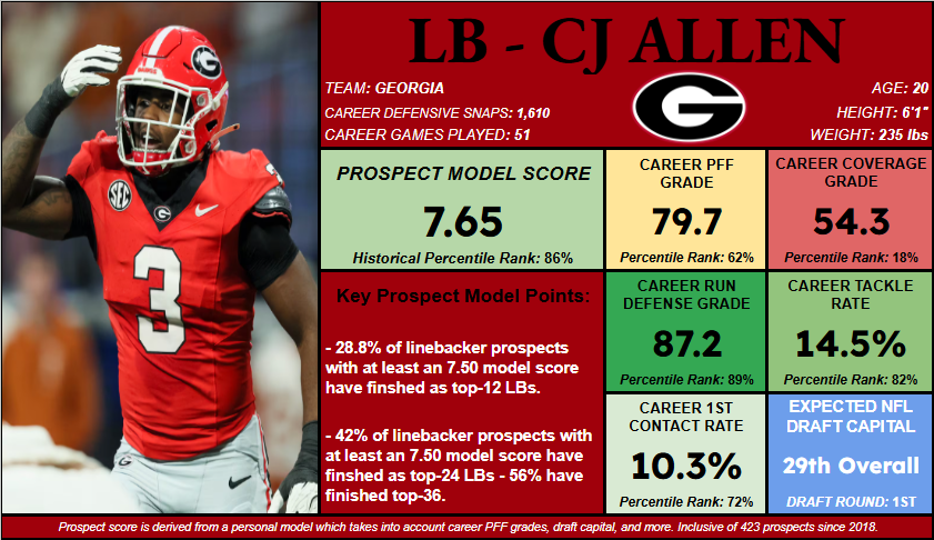- Allen comes out of Georgia as a better tackler and run defender than Walker in this model, and that’s helped him earn a slightly higher score with comparable draft capital.