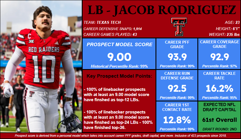 - Jacob Rodriguez thrives in this model, checking every box: Based on this model, it wouldn’t be a surprise to see Rodriguez eventually emerge as the IDP LB1 from this year’s class.