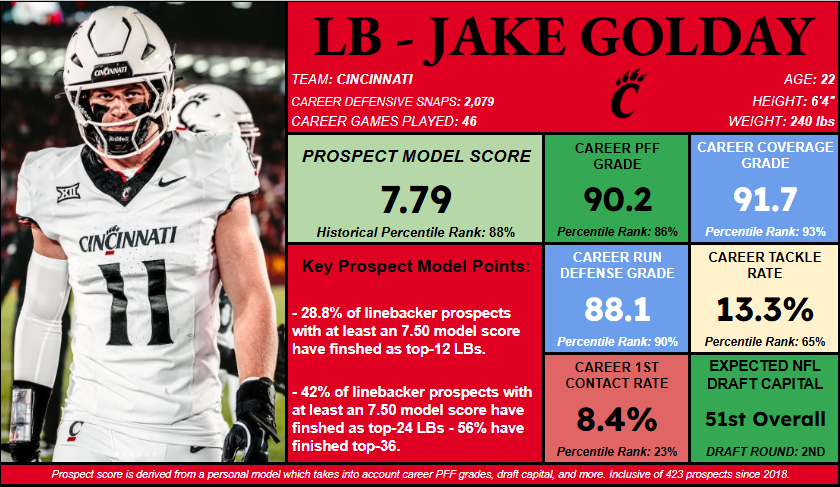 - Golday is also one of the more versatile linebackers in this class, spending about 29% of his snaps on the edge and 27% in the slot, making his strong career PFF grades even more impressive.