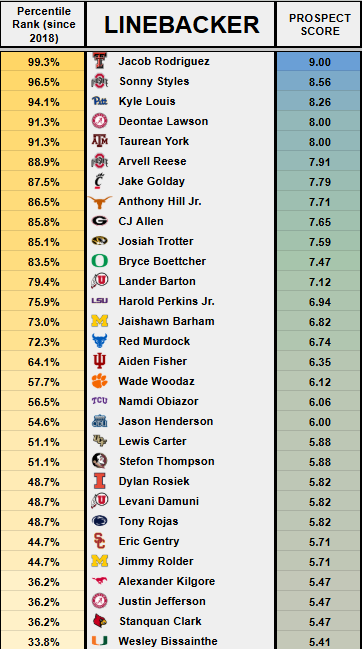 - The prospect pool for this model consists of 364 past linebacker prospects dating back to 2018.