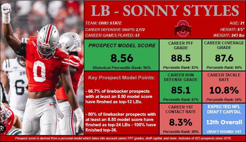 - Styles scores very well in the prospect model, delivering high grades for his college career, putting him in an ideal bucket of past top IDP finishers, including Fred Warner, Jordyn Brooks, Nick Bolton, and Zack Baun.