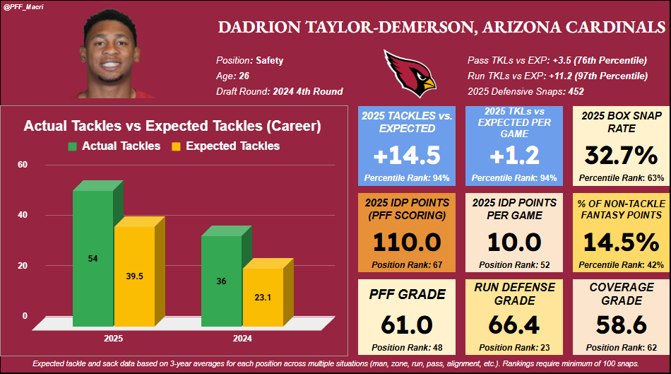 As was the case with the previously mentioned Lathan Ransom, Taylor-Demerson represents a safety who flashed strong IDP potential in limited opportunities and could now be walking into a larger opportunity in 2026. Depending on whether the team re-signs pending free agent Jalen Thompson, Taylor-Demerson is currently the next man up to play a starting role next to Budda Baker this coming season.
