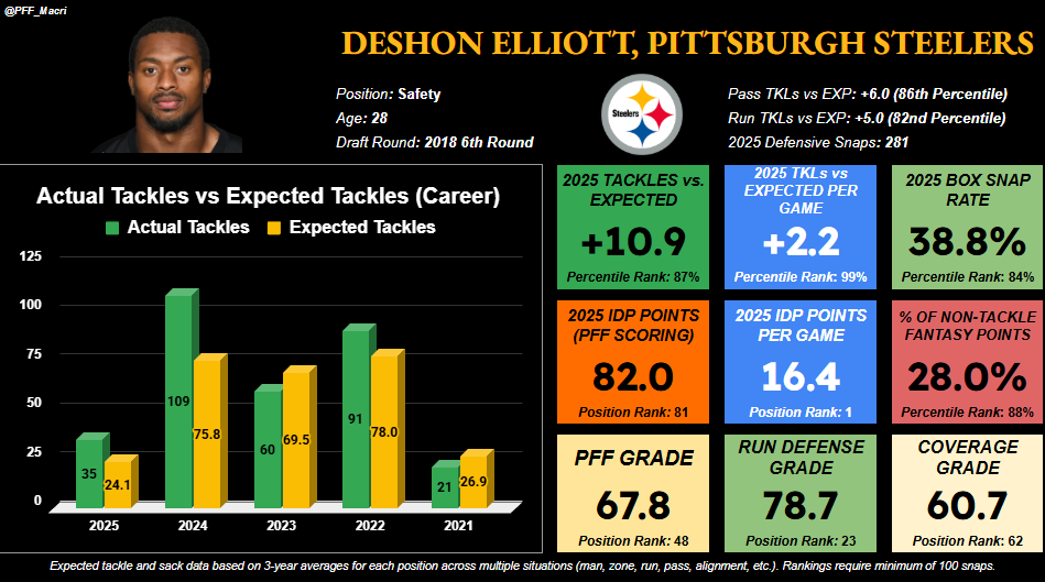 Elliott played just five games, averaging 16.4 points per game, in large part due to elite tackling ability – evidenced by his 2.2 tackles over expected per game, a 99th percentile mark for the position. As a result, Elliott finished among the 87th percentile in tackles versus expected overall and would have been a real threat to lead the entire position if he played the full season. This was also the case last year. In a part-time role, Elliott finished third at the position in this regard despite averaging just 87% of the team’s snaps. After signing an extension in 2025, Elliott’s role became full-time, but he was, unfortunately, too banged up to fulfill those duties this year, which also creates our target window this offseason.