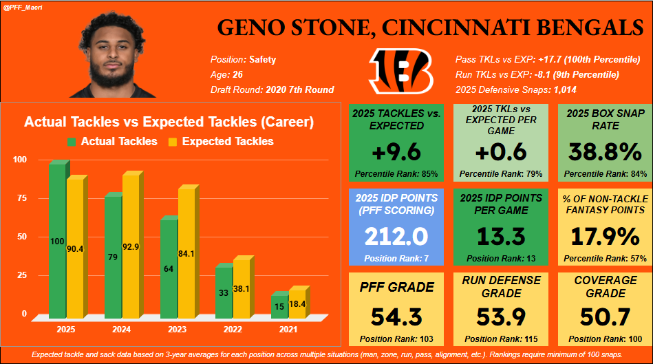 Stone doesn’t bring much name value at all, though he should still be a player we can use in offers to potentially sweeten the pot of a larger deal, coming off a strong IDP season in 2025.