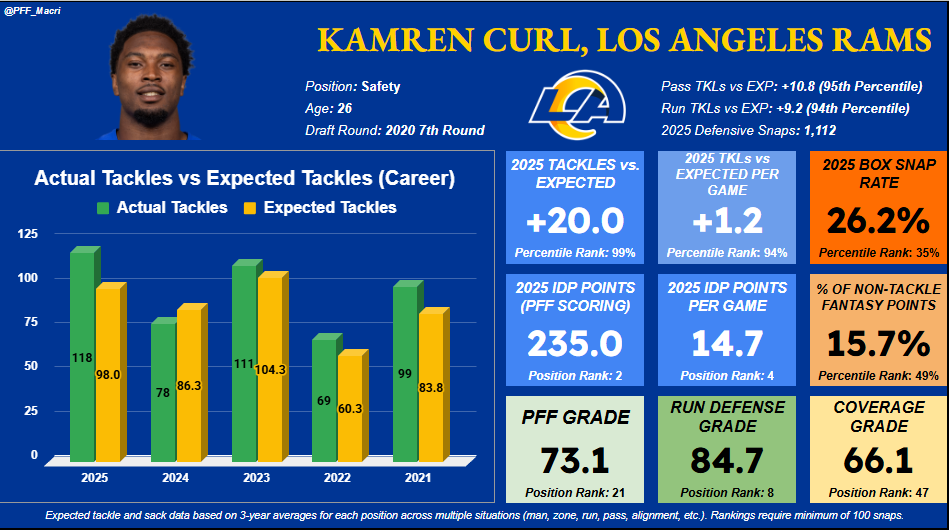 The instability of safety production is a big part of why we’ll want to move on and potentially sell Curl at the peak of his value, as there will more than likely be another shift among the top IDP scorers at the position next season. Everything went Curl’s way in 2025, racking up a 99th percentile mark in tackles versus expected, despite playing closer to an average rate of snaps in the box, and delivering enough big plays to put him over the top. Curl should be a better IDP option than Stone for those who are unable to move on from him, but ideally, we’ll be able to still find a strong replacement if we can offer him in an accepted deal.