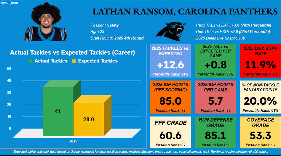 Several rookie safeties are coming out of this season who could end up delivering in a big way in Year 2, but a personal favorite has to be Ransom, who only started once in 2025 and flashed a lot of IDP potential in his opportunities. Ransom was mostly a part-time player in Carolina’s defense, typically averaging around 20 defensive snaps per game, which kept him off IDP radars for the most part while also keeping his price tag low enough that he shouldn’t cost much to acquire this offseason.