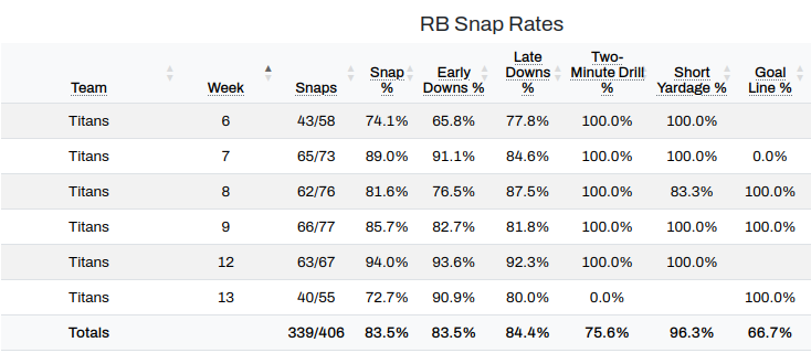 Pollard finished his first season with the Titans averaging 12.5 PPR points per game, which is right on the borderline of RB2 and RB3. However, Pollard received much more volume when Tyjae Spears was out. He averaged 83.5% of his team's offensive snaps in games that Spears played fewer than 20 snaps and Pollard was healthy, as pictured below. In those games, he averaged 15.0 PPR points per game with 18.8 rushing attempts per game and three receptions per game. Spears is starting the season on injured reserve, making Pollard a safe start for the first month of the season.