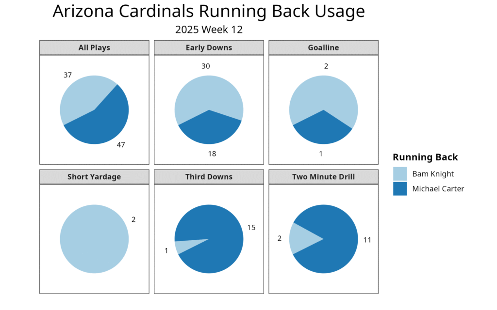 Arizona spent all game with a two-man running back rotation. Knight was the Cardinals' lead back on early downs, and Carter was their third-down and two-minute drill back. Knight scored the touchdown, but he was not effective in the run game with 10 carries for 12 yards. Carter led the team in rushing with 28 yards on five carries.