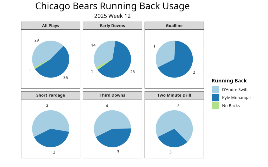 Kyle Monangai leads the Bears backfield: The seventh-round rookie played more offensive snaps than D’Andre Swift for the first time in a game where both were active, and he led the team in carries.
