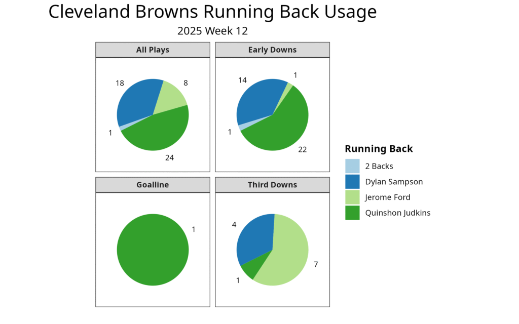 The Browns have used Judkins as their primary early-down back, Dylan Sampson as his backup, and Jerome Ford as the third-down back for most of the season. The was the rotation for the Browns' first three running backs, as Judkins played 19 of 23 snaps on first and second downs.
