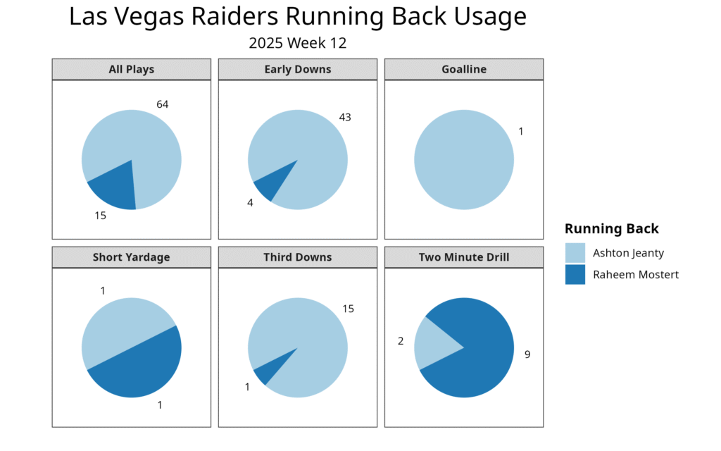 Jeanty has been the Raiders' lead running back all season, playing 74% of the offensive snaps on the season. That has included at least 77% of the snaps on early downs, short-yardage situations and goal-line snaps. He’s split time with Raheem Mostert in passing situations. Mostert has also been the primary backup on early downs. Since Week 4, Mostert has played 106 snaps, while Dylan Laube played six snaps as the only other running back.