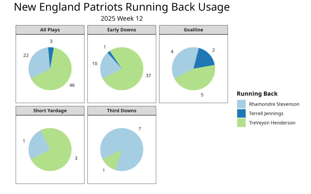 Henderson was the clear early-down back, and Stevenson was the clear third-down back, which is the opposite of what most people expected heading into the season. Henderson ran 18 times for 66 yards, while Stevenson ran six times for five yards. This split for New England will likely continue.