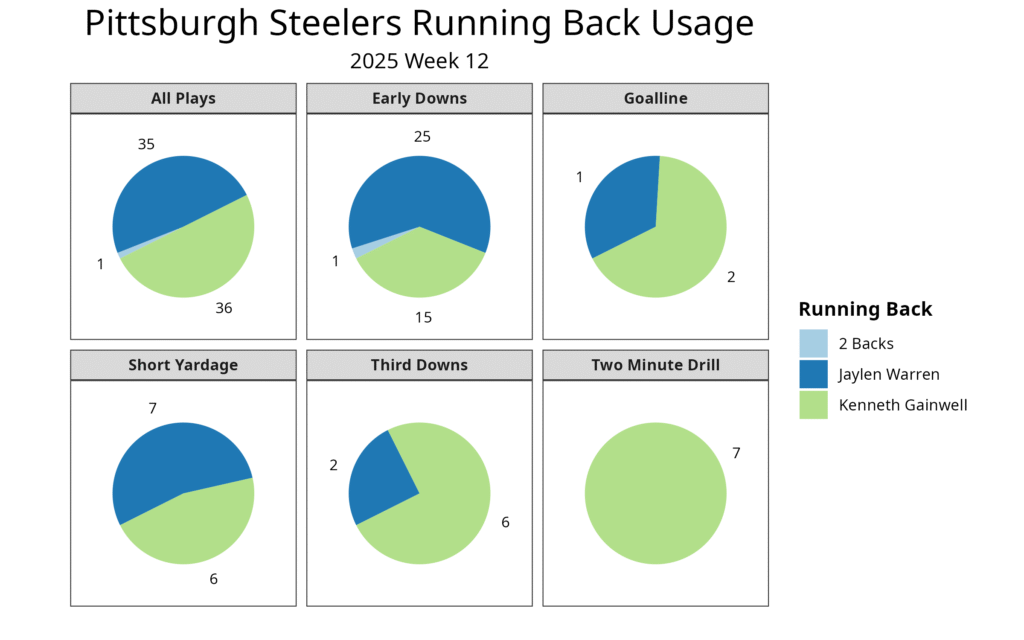 From Weeks 6-10, Warren had played 56.7% of the snaps to Gainwell's 39.6%. Warren played at least two-thirds of the snaps on early downs and in short-yardage and goal-line situations, while Gainwell played at least two-thirds of the third-down and two-minute drill snaps. This week, everything shifted a little more in Gainwell’s favor. Warren’s injury has likely contributed to this, although Gainwell’s big plays may have also played a factor.