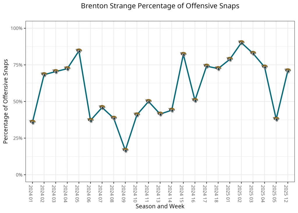 Strange played 71% of Jacksonville's offensive snaps, which was a tad lower than the first four weeks of the season, but that is understandable given how much time he missed. He played 71% of the offensive snaps, taking 60% of the 11-personnel snaps on early downs, 77.8% on third downs and 77.4% in two-tight-end sets. Ideally, he will be back to playing 80% of the offensive snaps by next week.