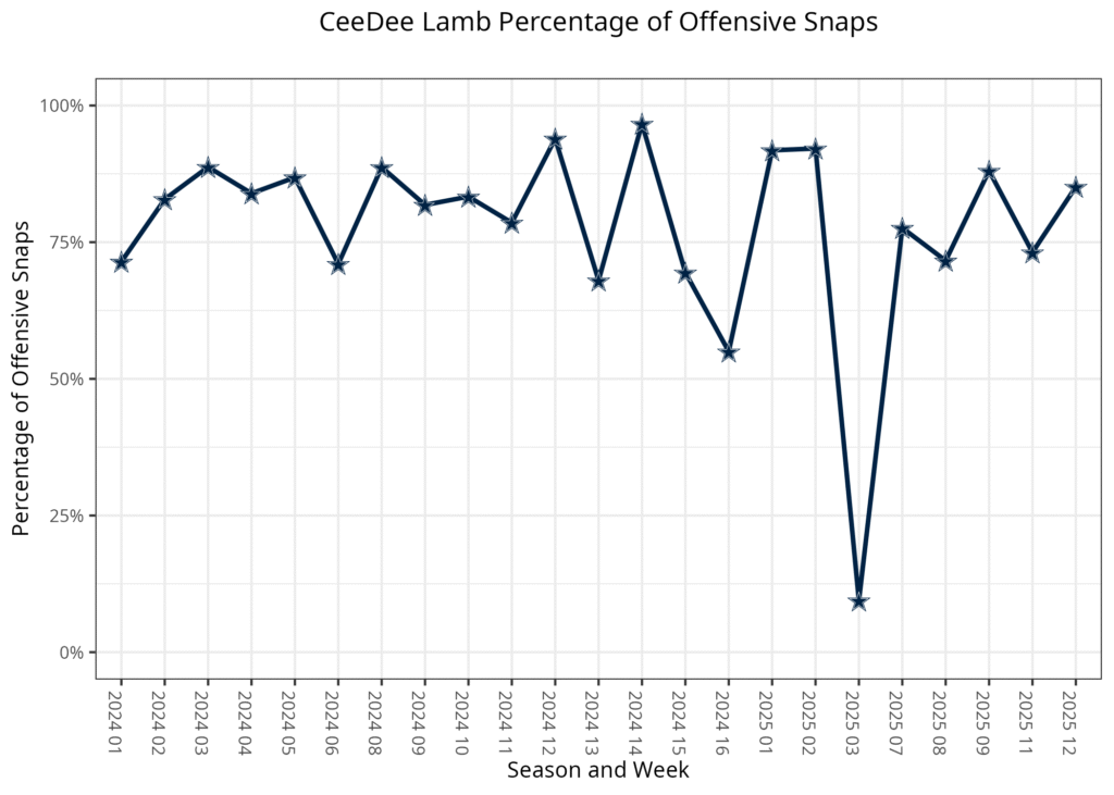 Lamb played 85% of the offensive snaps, which was only the second time he surpassed 80% since Week 2, while Turpin’s 47.3% was his most since Week 4. This change shouldn’t have a major impact on the Cowboys receivers' fantasy value for the rest of the season, but Mingo could have value if some of the Cowboys' wide receivers start suffering injuries.