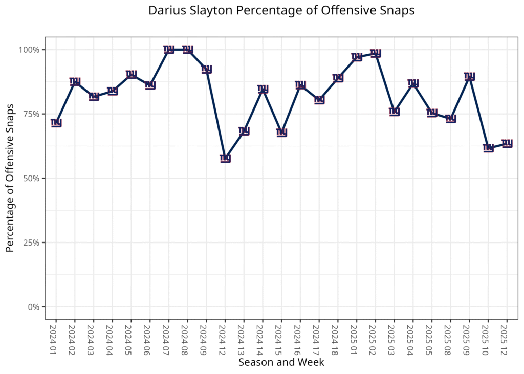 This week, New York returned to its top three receivers from 2023. Slayton was their X receiver, Hodgins was the Z, and Robinson was in the slot in three-receiver sets. Unlike 2023, Robinson has been playing in two-receiver sets. While Hyatt had only recently rejoined the team, he played slightly more snaps than Slayton this week. This was likely because Slayton still isn’t 100%. He didn't practice on Wednesday and was limited in practice on Thursday and Friday, but he wasn’t given a game status.