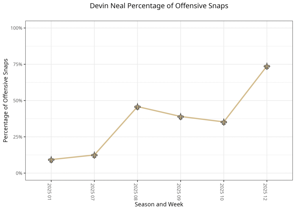Hill's presence made the Saints comfortable with only having two active running backs for this game, leaving Audric Estime as a healthy inactive. Kamara wasn’t 100% leading into this game, as he was limited due to an ankle injury and questionable for the game, but he ultimately played. The veteran played his usual role to start the game despite the ankle injury, playing 11 of the first 14 snaps, while Neal took two snaps in clear passing situations.