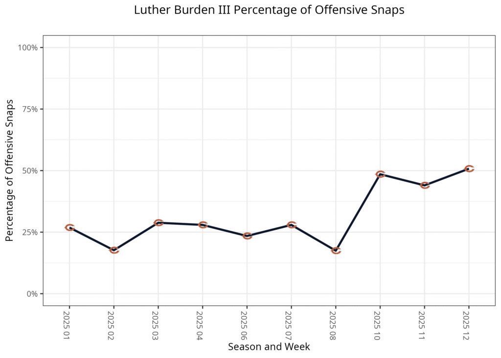 Despite this, Luther Burden III has earned a larger role in the offense. Last week, this was largely at Olamide Zaccheaus‘ expense. Burden played 100% of the snaps in three-receiver sets a week ago. Burden didn’t play as much in three-receiver sets this week, but he played a higher percentage of the total snaps. Burden only played 61.1% of three receiver sets, but played two-thirds of the single receiver sets, which were his most for a game since Week 3. This led Burden to play over 50% of the snaps for the first time in his NFL career.