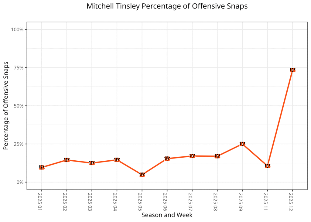 As a result, Ferguson’s playing time remained limited outside of third downs. He had been viewed as a deep sleeper, but without 12-personnel usage, that path becomes much tougher. Similarly, Parkinson and Allen will struggle for consistency while splitting so many early-down 11-personnel snaps.