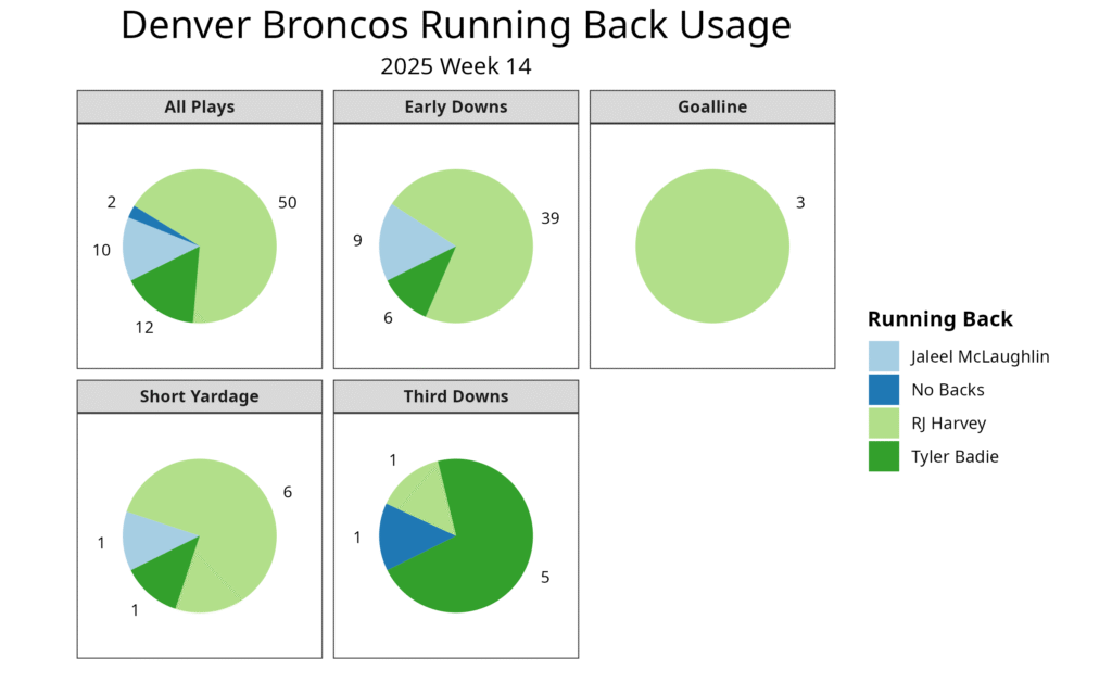 This week, Harvey played 72.2% of the snaps in normal early-down situations, the second-best rate of his career. He hasn’t played much in two-minute drills this season, but Denver didn’t have a two-minute drill in this game. He similarly hasn’t played much on third downs, but Denver avoided third downs for most of the game. This all led Harvey to play more than usual.