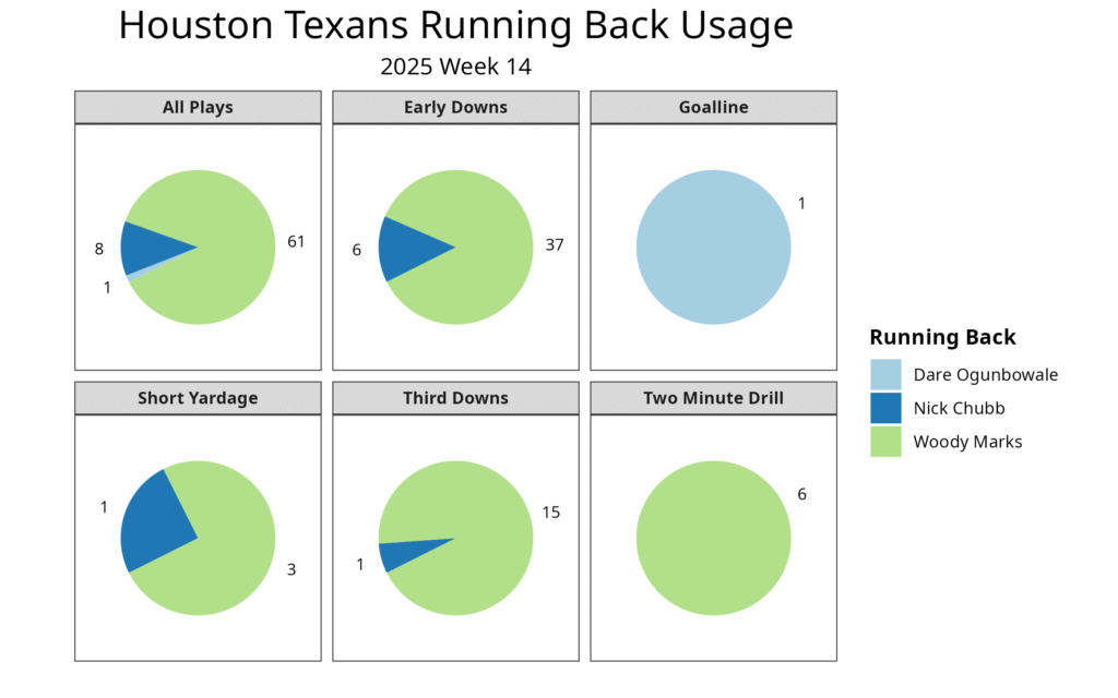Woody Marks took over as the Texans’ top running back in Week 10. Over the last four weeks, he has played 67.1% of the offensive snaps, with Chubb at 23.9% in that span. Marks didn’t practice on Wednesday and was limited on Thursday with an ankle injury, but he still started this game. He took 17 snaps over the first three drives compared to eight for Chubb, running the ball eight times while Chubb had one carry and was used primarily as a blocker.