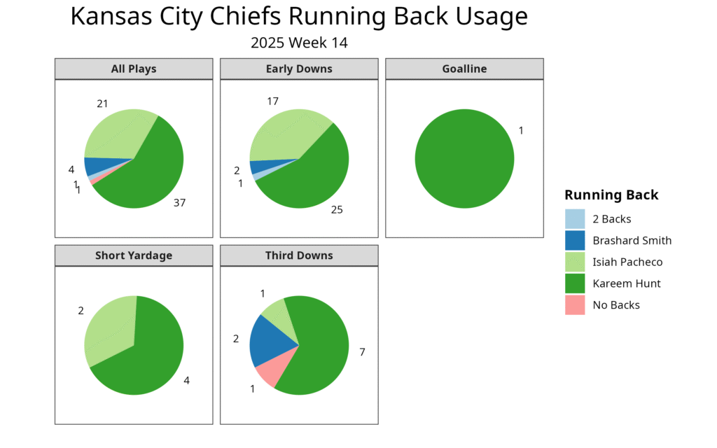 Pacheco returned last week in a limited role, with Hunt logging 14 carries to Pacheco’s three. This week, Pacheco was far more involved, running nine times for 30 yards, while Hunt ran 12 times for 30 yards and a touchdown.