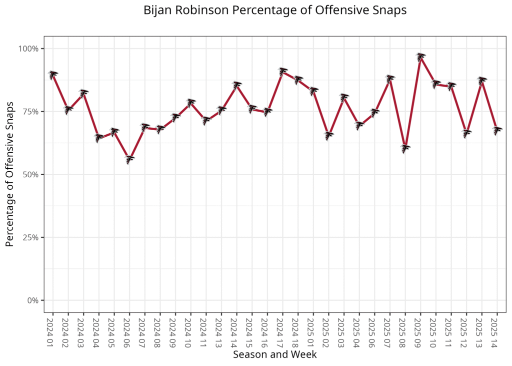 Robinson has played 77.8% of the offensive snaps this season compared to Allgeier's 29.2%. Robinson dominated snaps on third downs and during two-minute drills, while the split is closer to 65-40 in short-yardage and goal-line situations. The Falcons run several plays with both running backs on the field, leading their percentages to add up to more than 100%.