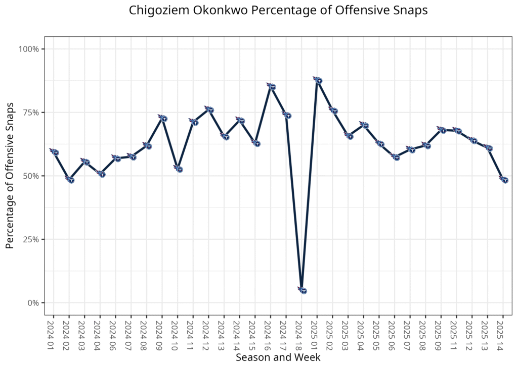 Okonkwo has been the Titans' top receiving tight end this season. He started the year playing at least 70% of the offensive snaps in three of his first four games, but he’s been held under 70% in each game since then. Tennessee has trusted Helm for a significant number of early down 11-personnel snaps, while Okonkwo has also been substituted out for David Martin-Robinson, at times, in 12 personnel. This rotation has typically left Okonkwo playing between 60-70% of the snaps, while Helm played 45-65% over the past two months.