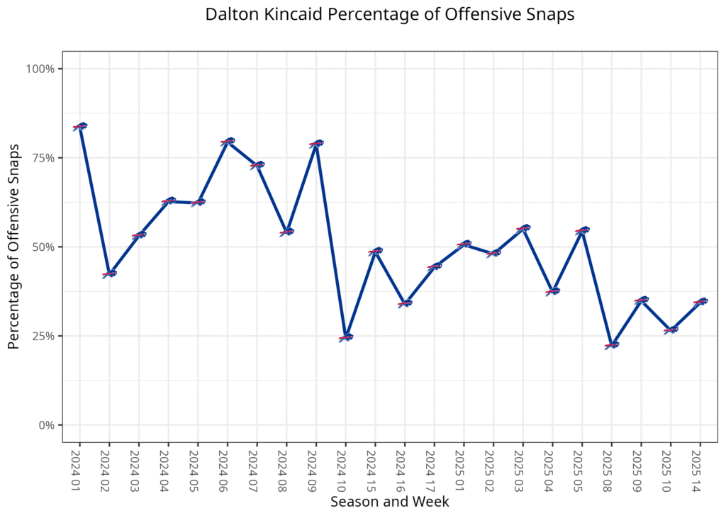 Kincaid played a little less than usual in his first game back, playing 34.4% of the offensive snaps. He played less than usual in most situations, outside of 11 personnel on third downs, where he played 58.3% of the offensive snaps. It was his first time playing over 50% since Week 5, and that was his second-best rate of the season. He similarly had his best route participation rate since Week 5, while his targets per route run remained among the league’s best.