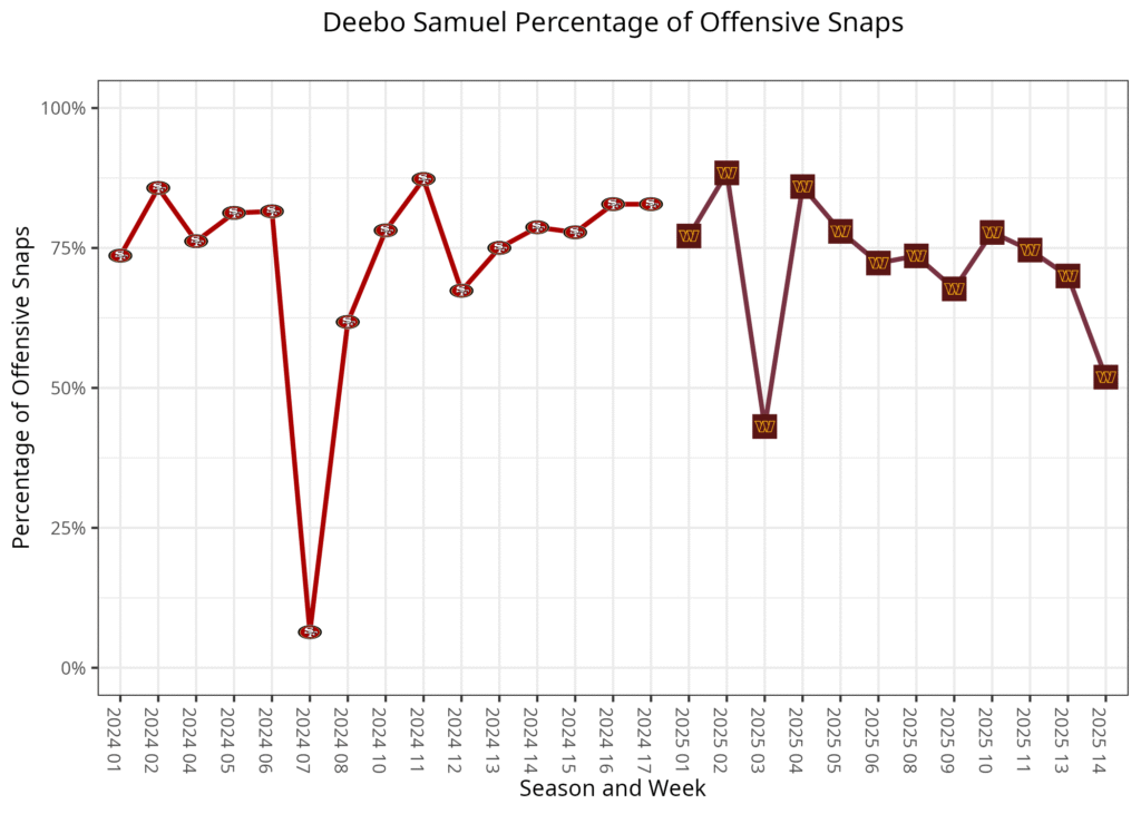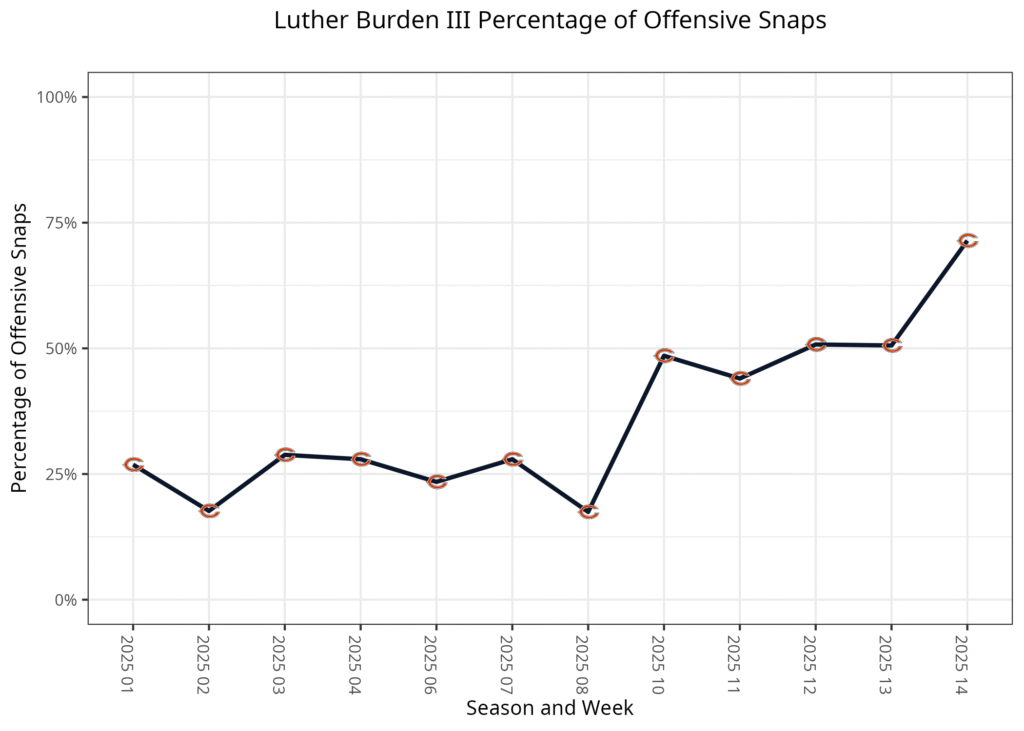 The Bears have spent this season with D.J. Moore as their X receiver and Odunze as the Z. Olamide Zaccheaus started the season as their slot receiver, but in recent weeks, second-round rookie Luther Burden III has taken over as the third receiver. Devin Duvernay and Jahdae Walker have played 12 and six offensive snaps, respectively, this season. Duvernay played more on special teams, and Walker typically was a healthy inactive.